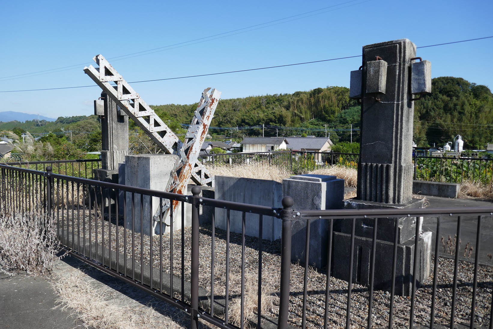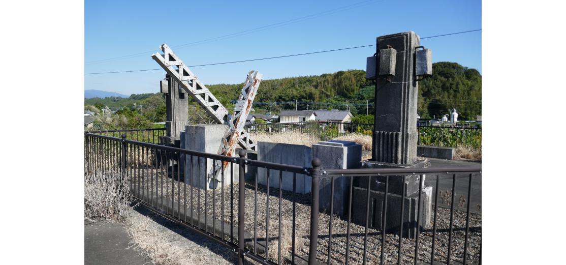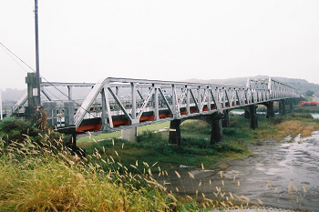 - (2)旧橋は新田原飛行場の格納庫の解体材333トンを使用して建造された.その一部の部材は撤去後に左岸側の道路沿いに展示されている.