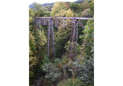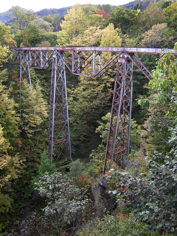 - (1)上路トラスは鈑桁をフィンク補強したようなもので,上弦材はI桁でその上に直接枕木が載る.トラスドガーダーと称することがある.鋼橋脚には溶接補強が見られる.