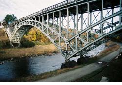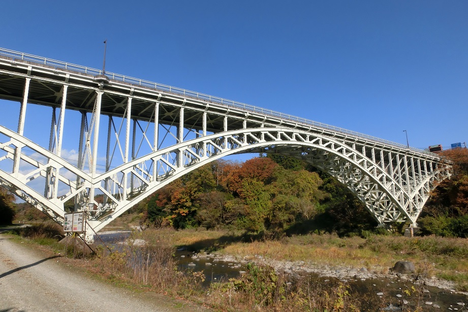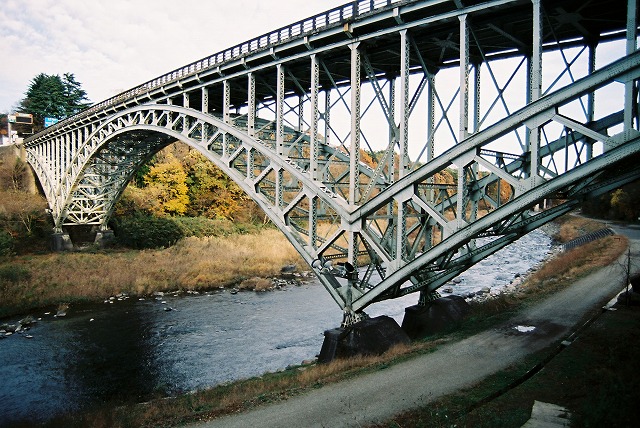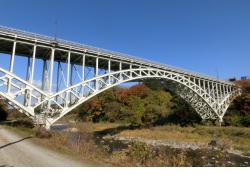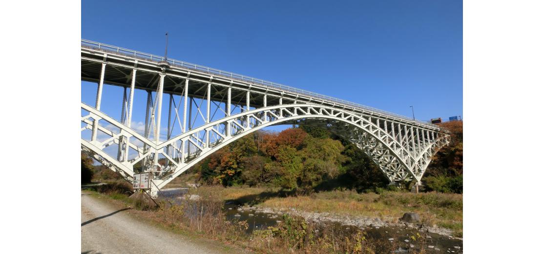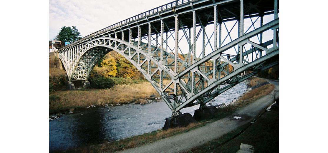 - (1)現在の橋は5代目となり,1931(昭和6)年から7年にかけて,国道路線変更工事により,この位置に架け替えた.橋長127.8m,幅員8.7mの3径間バランスドアーチ橋である.水面からの高さが約 23mあり,力学的に最も安定した近代的な姿に変わった.