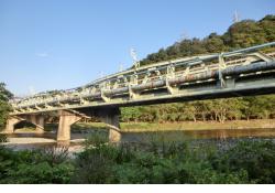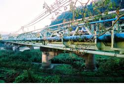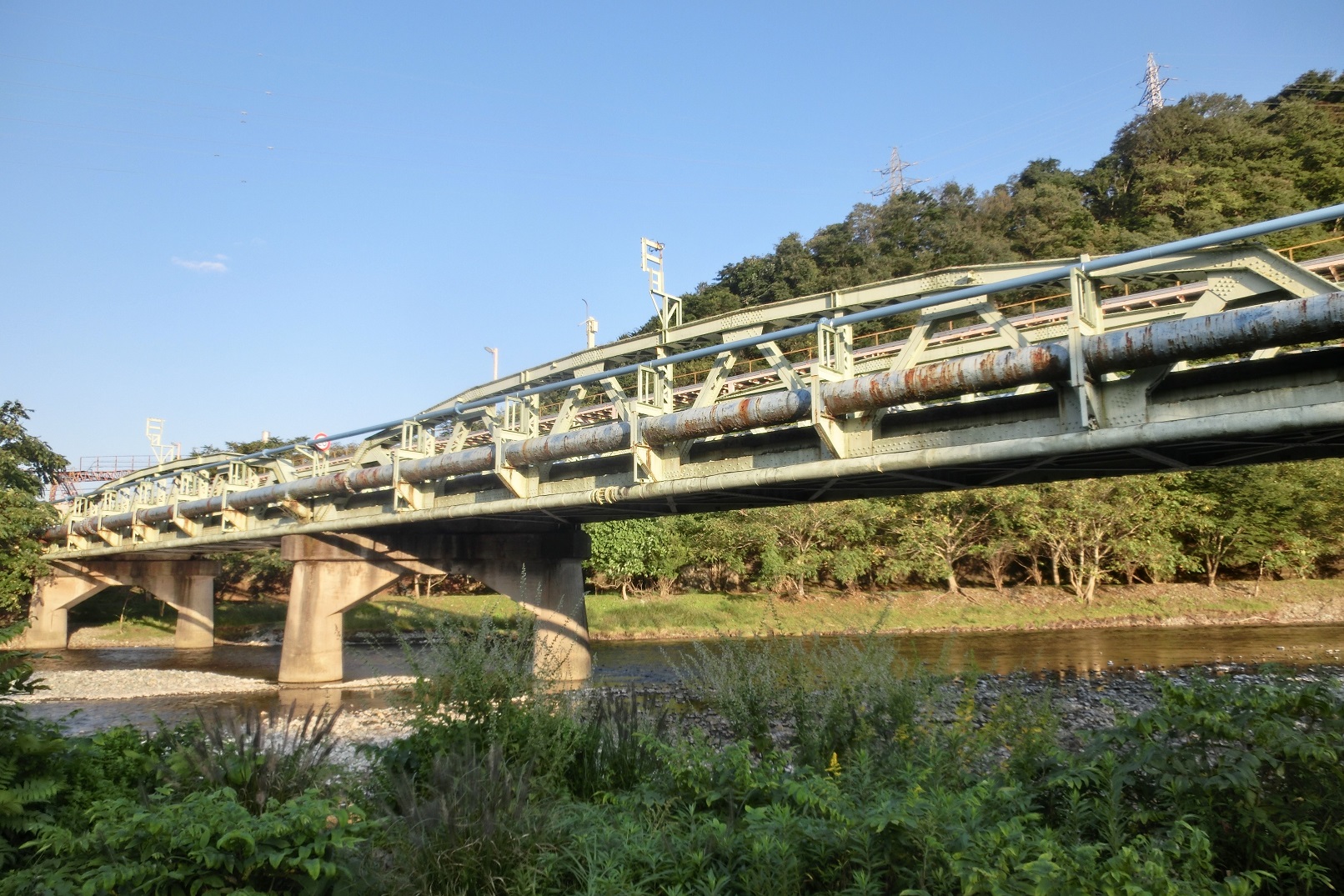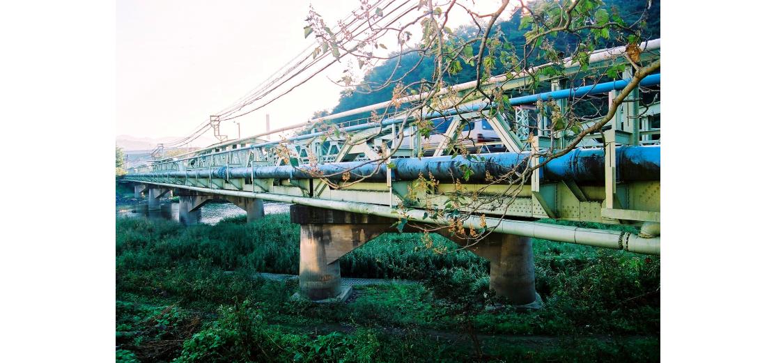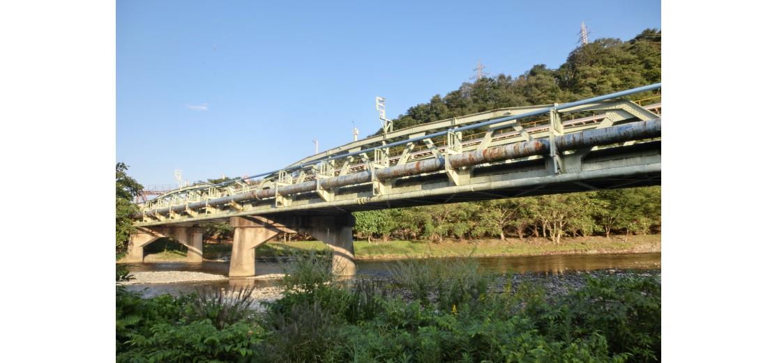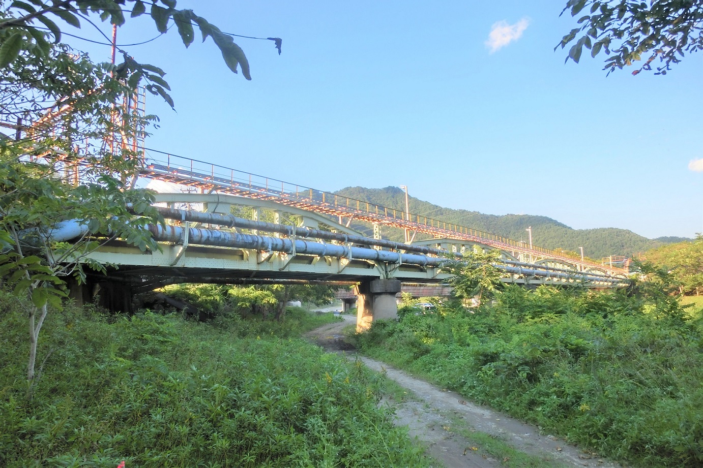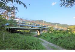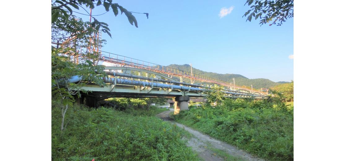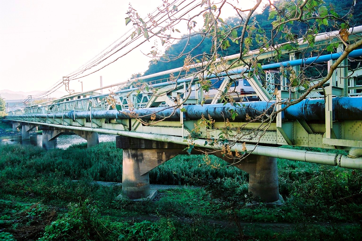 (1)工場専用橋らしく両側にパイプが取り付けられている.
