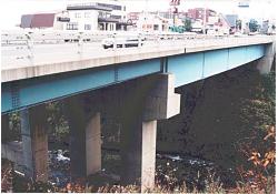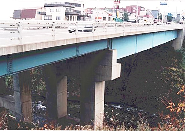 - (1)1970年に当該橋梁に平行して新橋を架設(単純活荷重合成鈑桁,橋長64m,幅員11.5m,支間長41+21.5m),旧橋は歩道橋とする.
