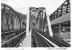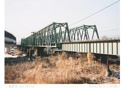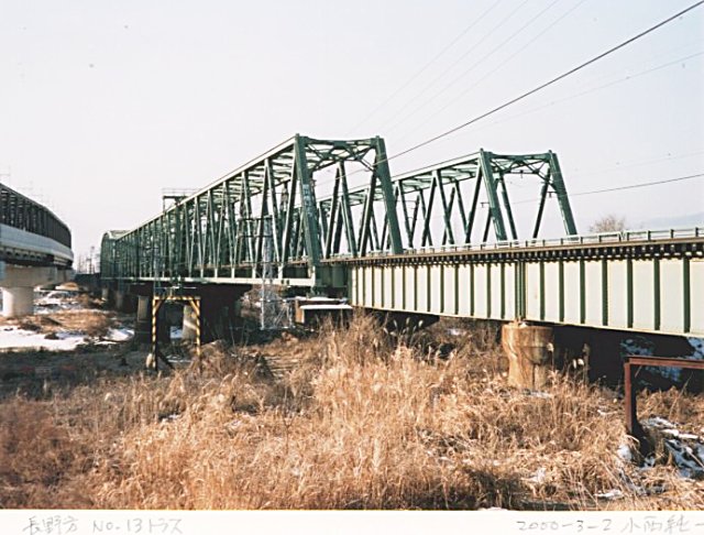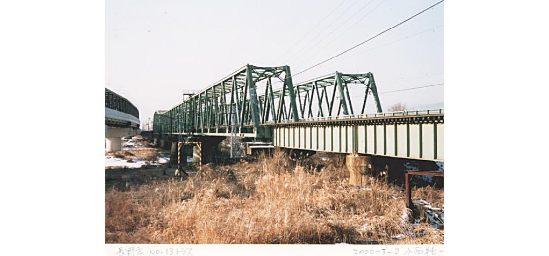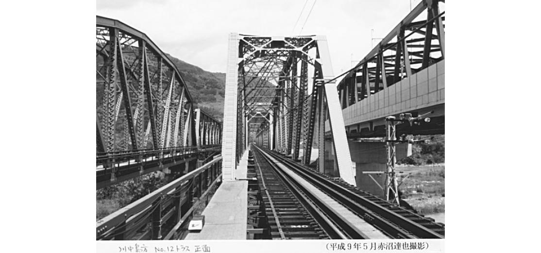 - (1)13連目の3径間連続トラスは,垂直材がない構造で,骨組は溶接構造の木曽川橋梁と同じ.