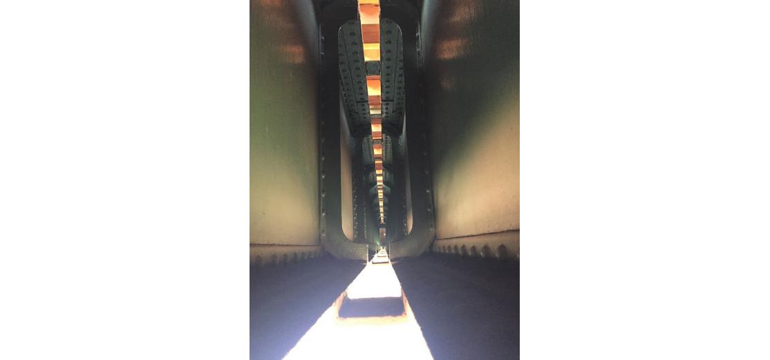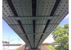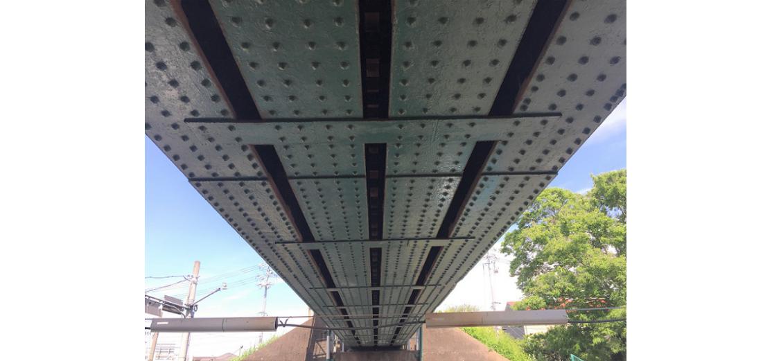 - (2)並列補強が施されている.在来桁の外側に追加するのではなく4枚の桁をほぼ等間隔に詰めて並べる方式であり,枕木は4枚で支持されている.
