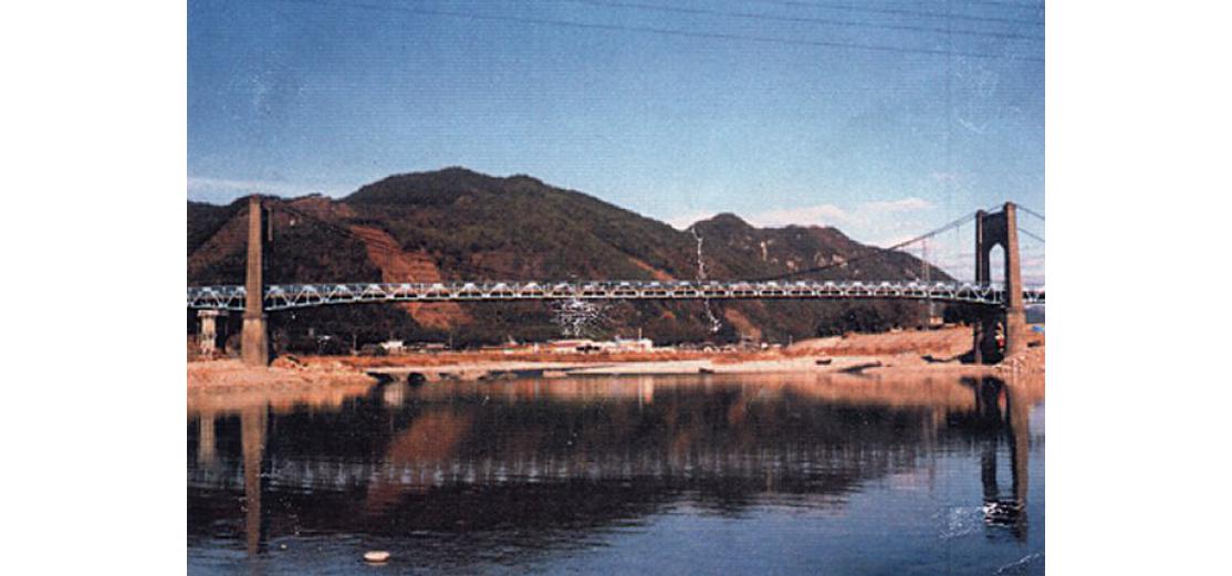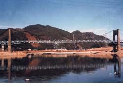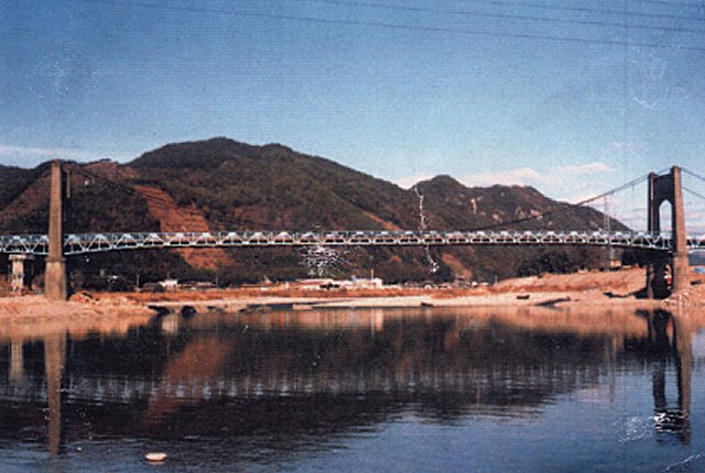 - (1)初代は3径間連続鋼トラス補剛の吊橋.1990年に平行して現在のワーレントラスが架設され1991年に撤去された.