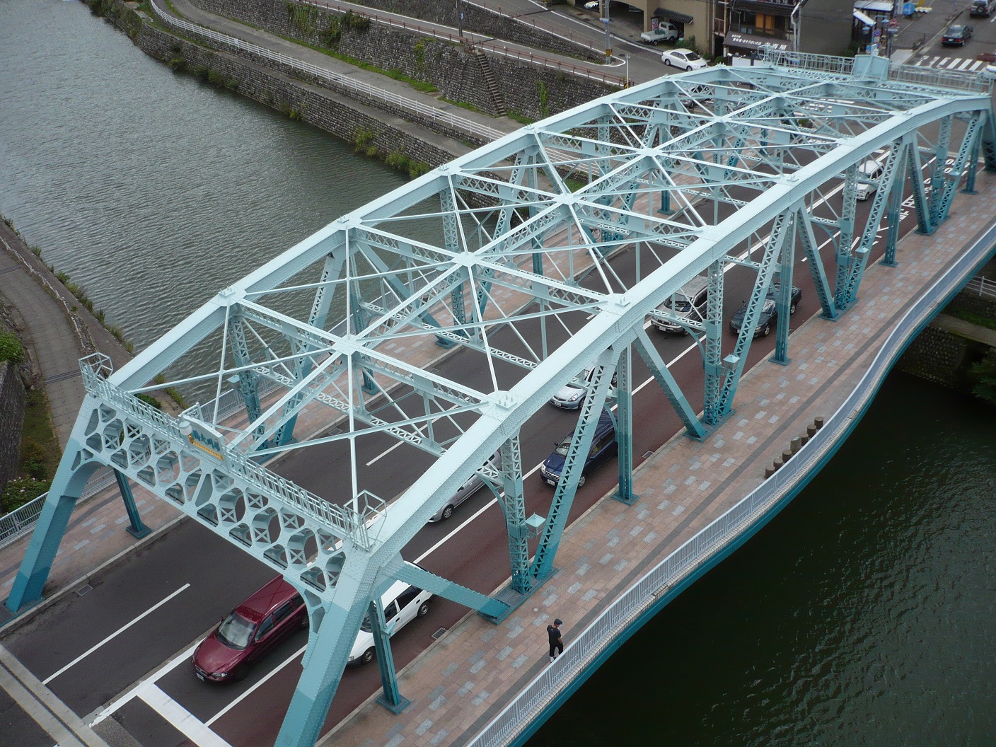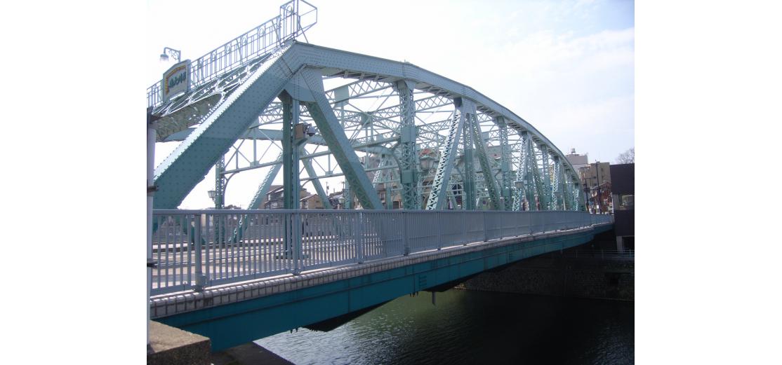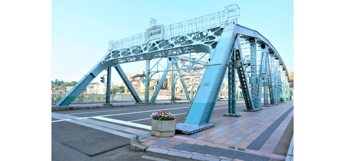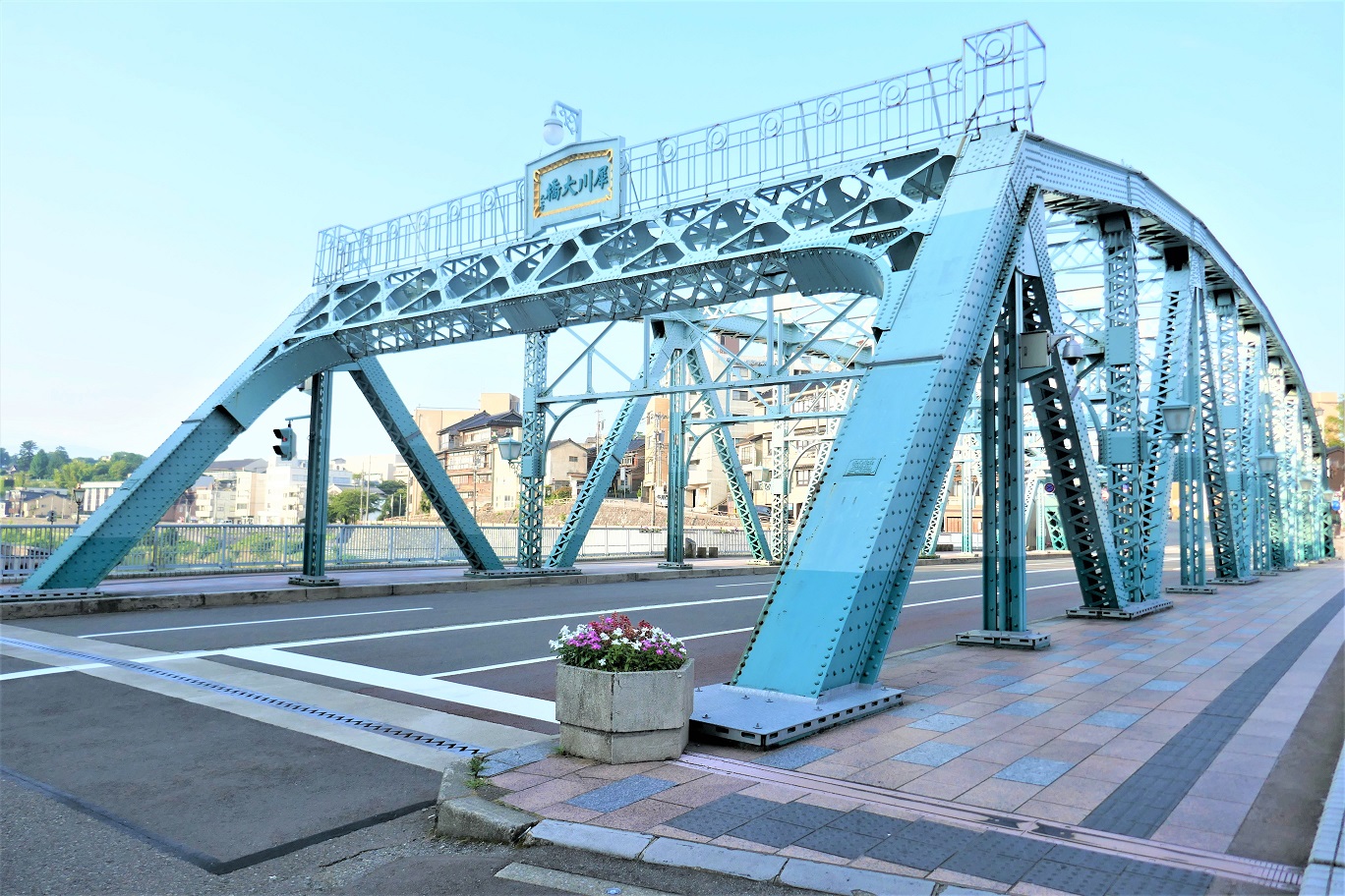 - (2)1994年,2018年に大規模修繕が実施された。 1994年の工事では,橋門構に金箔を使用した橋銘板。歩道が拡幅され、バルコニーが設置された。加賀友禅染をイメージした塗替塗装の色はウェブアンケートを反映。 2018年の工事では,施工者が補修設計業務に参画する方式が採り入れられた。いずれの工事においても外観の大きな変更はない。
