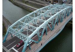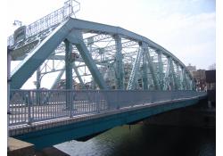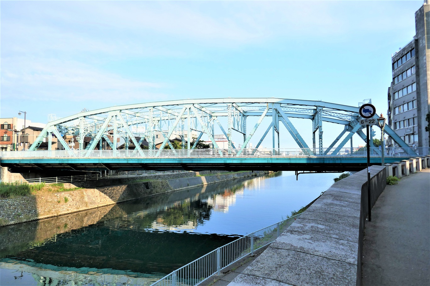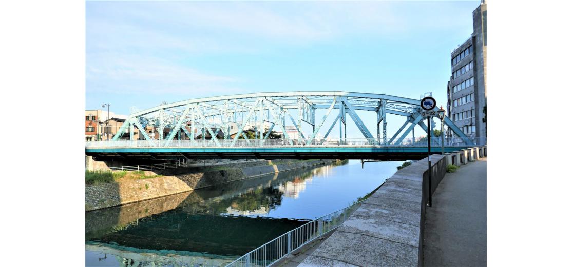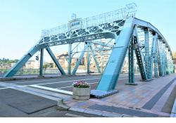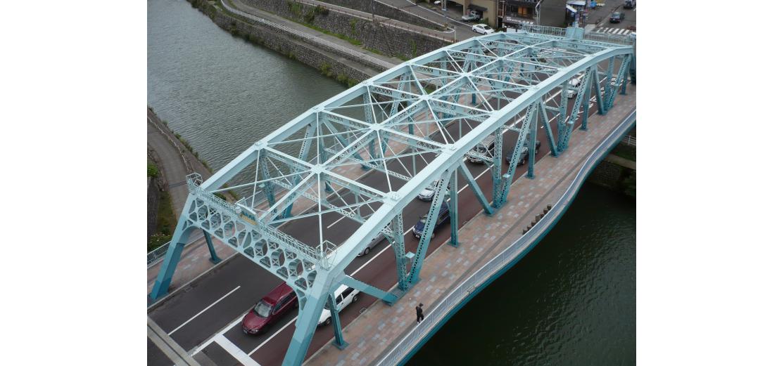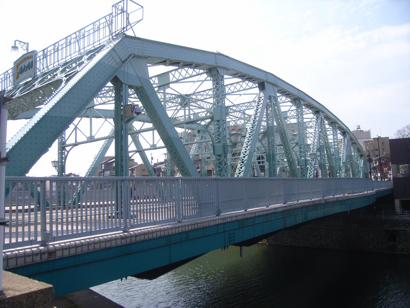 - (2)1994年,2018年に大規模修繕が実施された。 1994年の工事では,橋門構に金箔を使用した橋銘板。歩道が拡幅され、バルコニーが設置された。加賀友禅染をイメージした塗替塗装の色はウェブアンケートを反映。 2018年の工事では,施工者が補修設計業務に参画する方式が採り入れられた。いずれの工事においても外観の大きな変更はない。