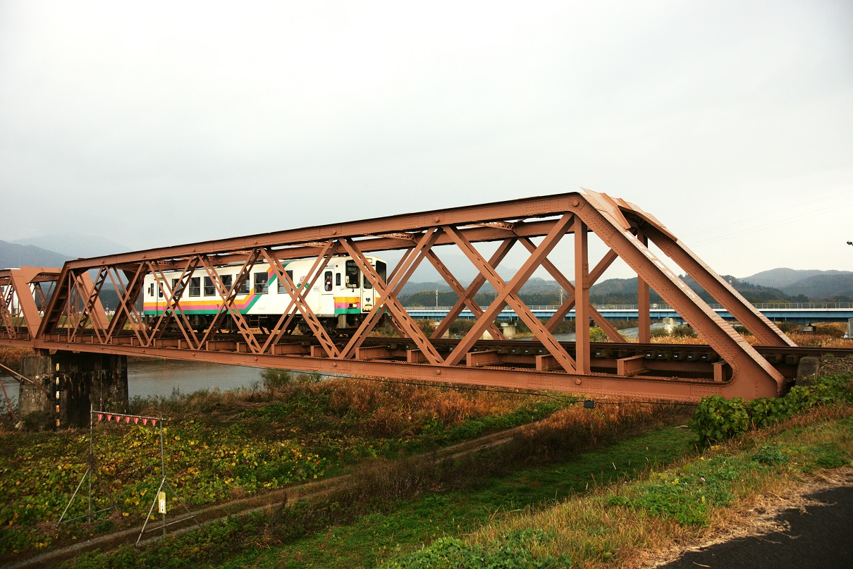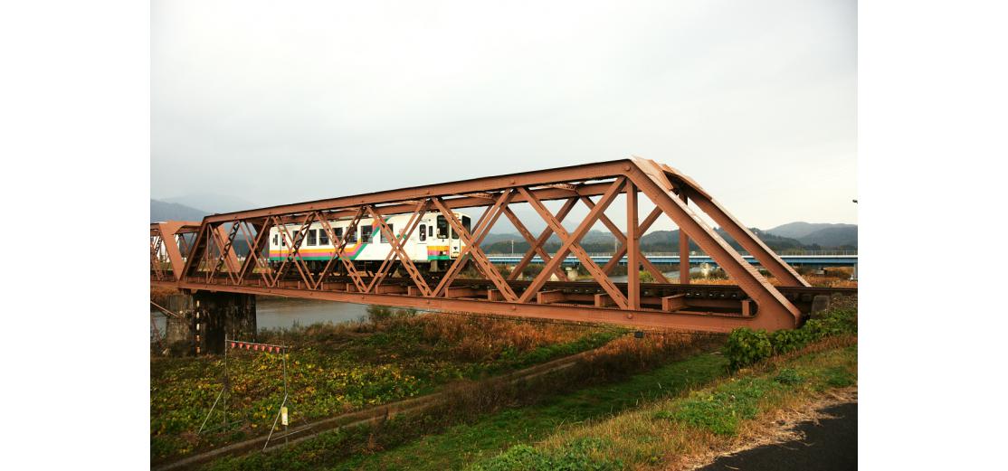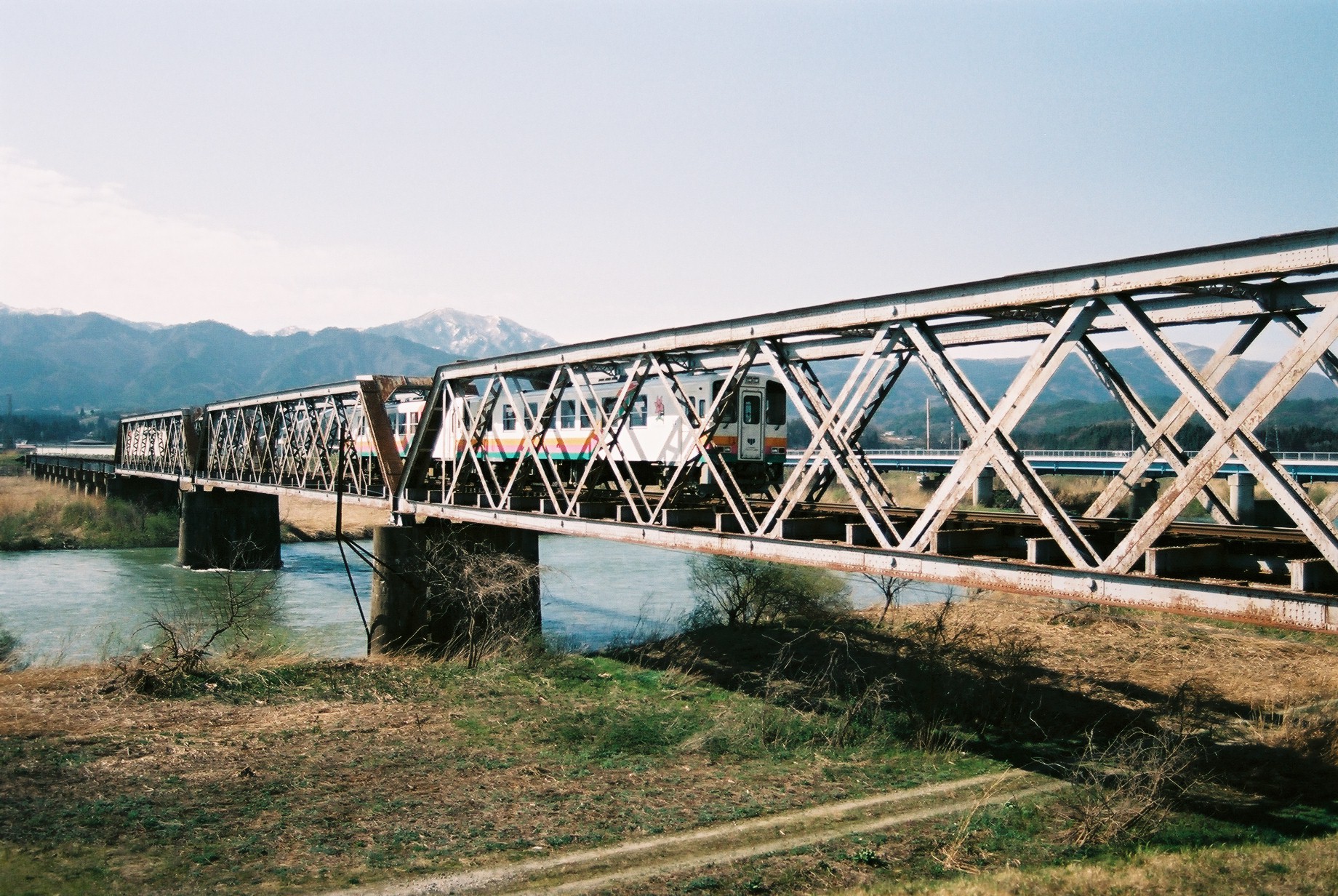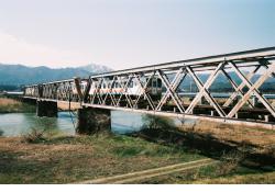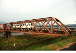 - (1)3連のトラスは,横桁寸法から,1887(明治20)年に完成した東海道本線木曾川橋梁初代錬鉄製200ftトラスの短縮改造と推定されるもので,鋳鉄製の支承を備えている.現位置には1923年に転用された.