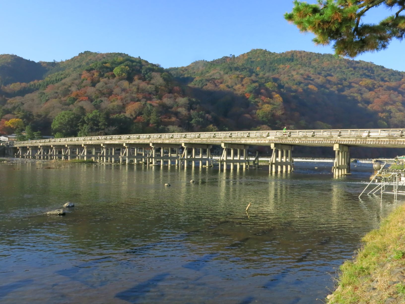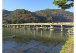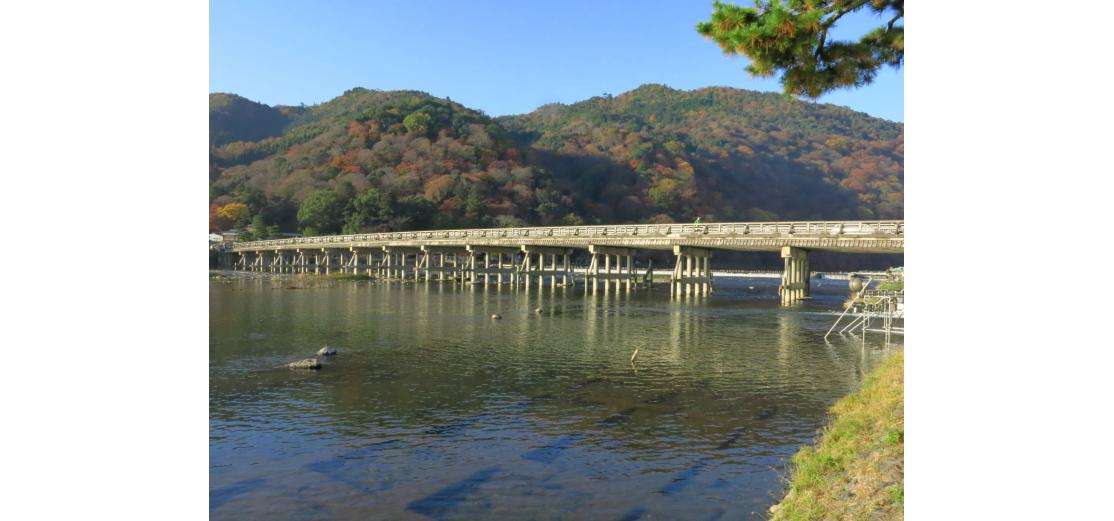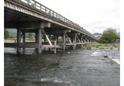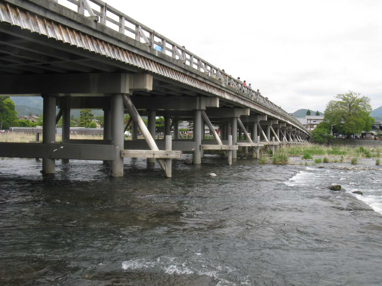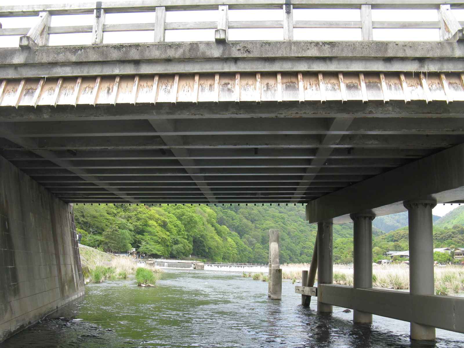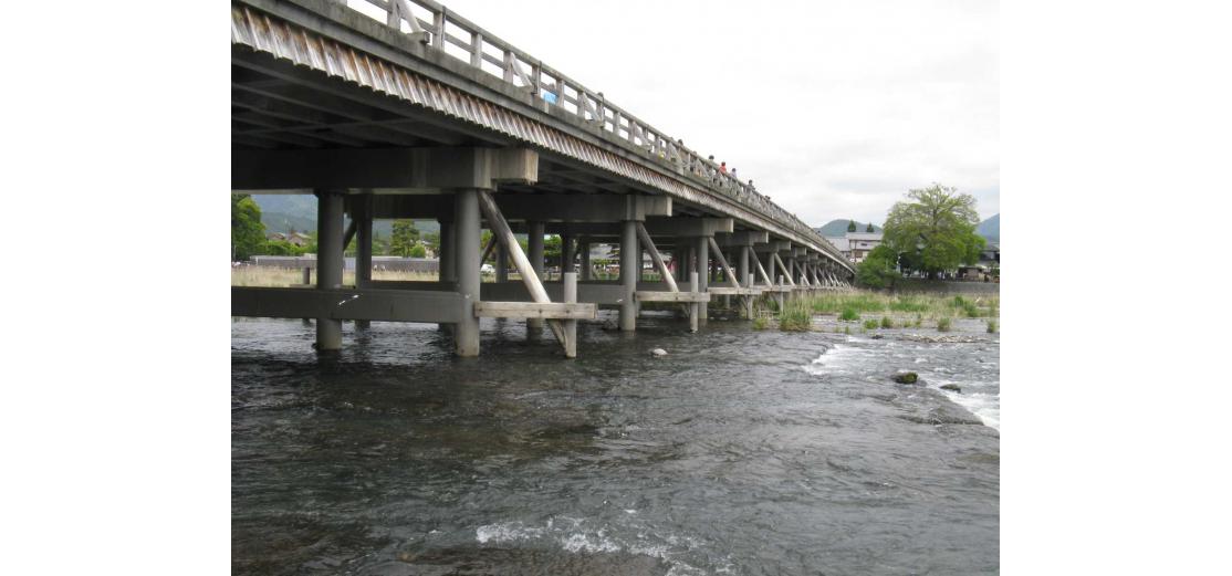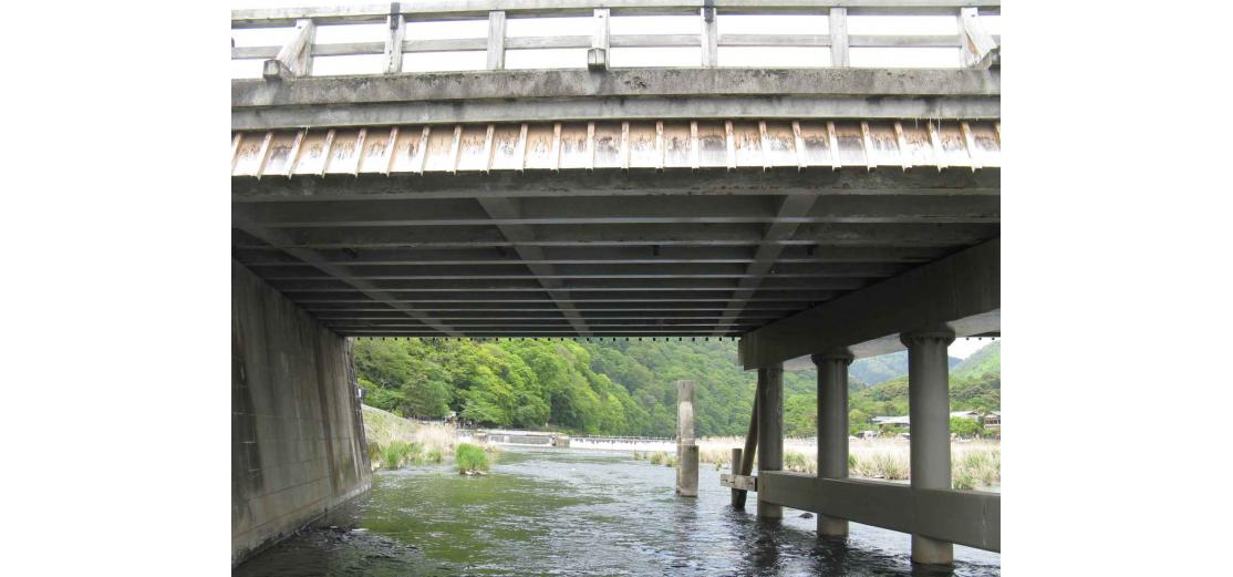 - (2)桁を守る雨覆板・橋脚を守る杭出し水制に日本の伝統的な木桁橋が再現されている.