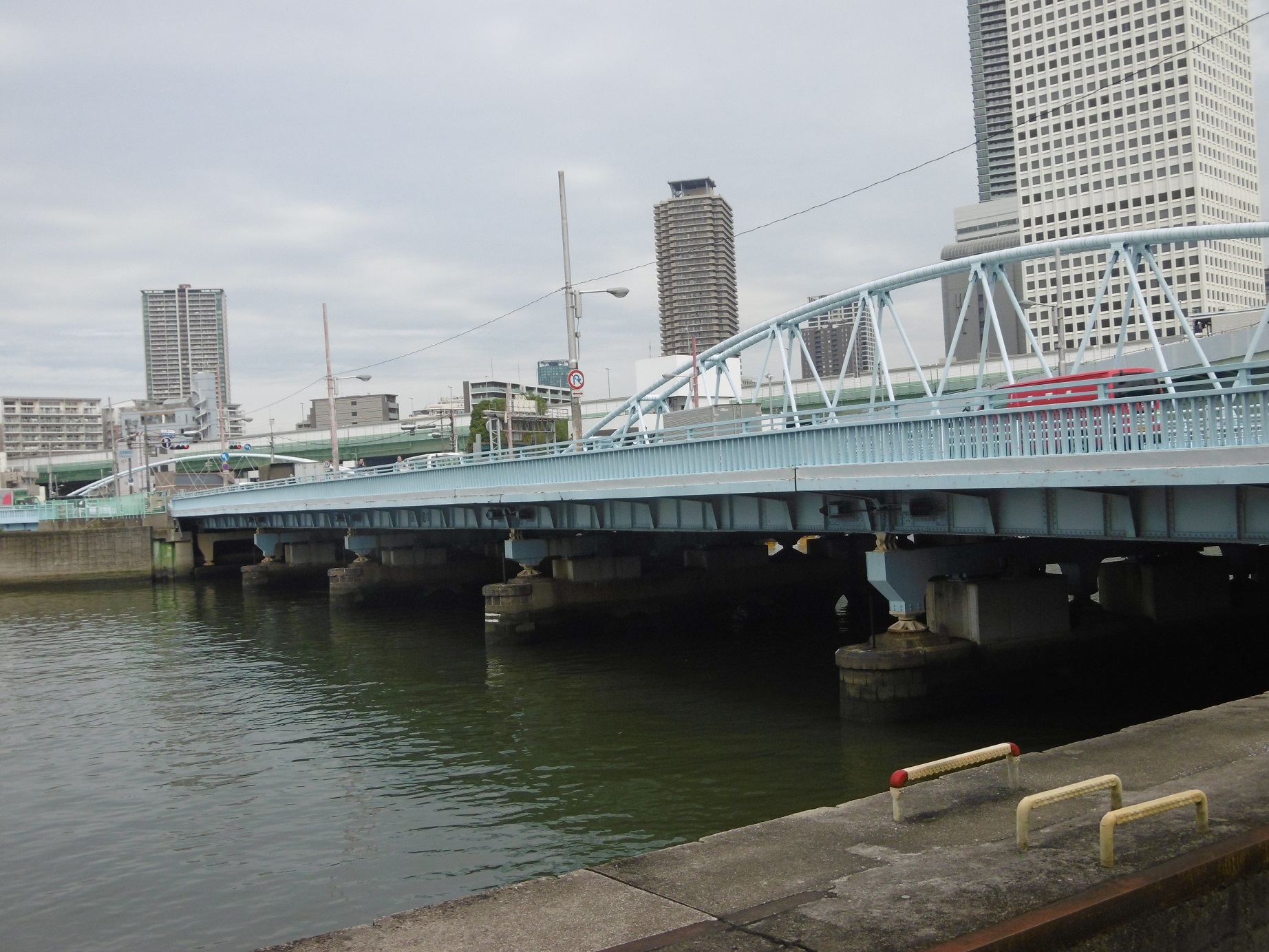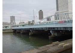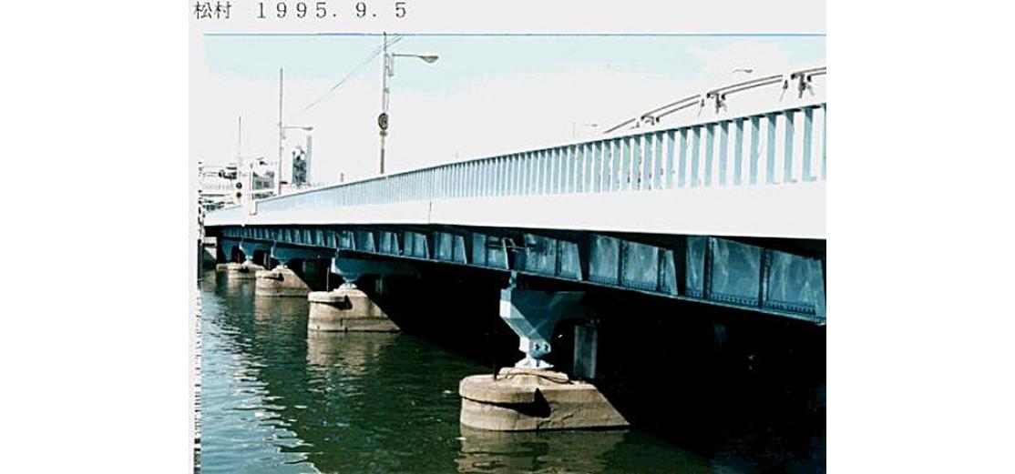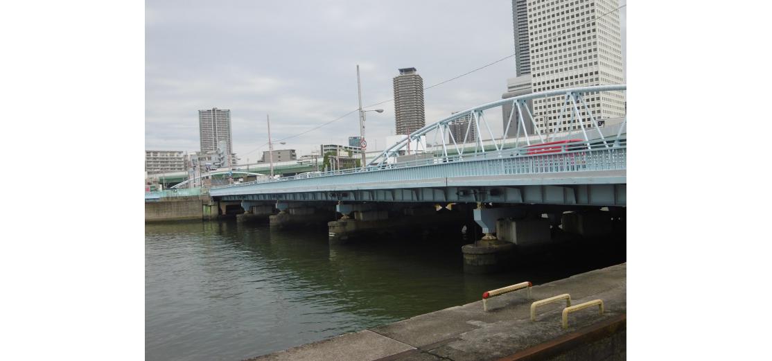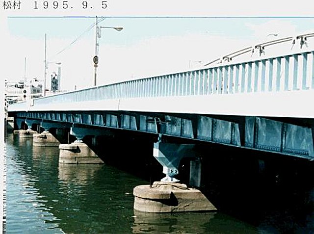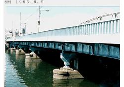 - (2)1963(昭和38)年に鋼床版に取り替えられ,ブラケットにて拡幅もされた。橋脚上に鋼製のラーメン形式の嵩上げ材が追加され,嵩上げされた。両岸に橋台が追加され,現在は7径間の鋼床版鈑桁形式となっている.