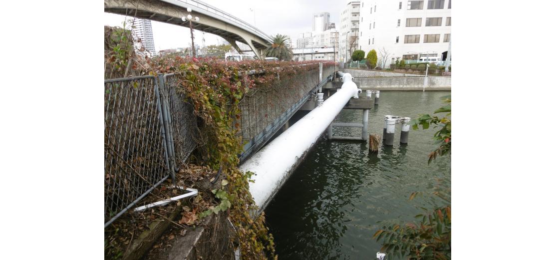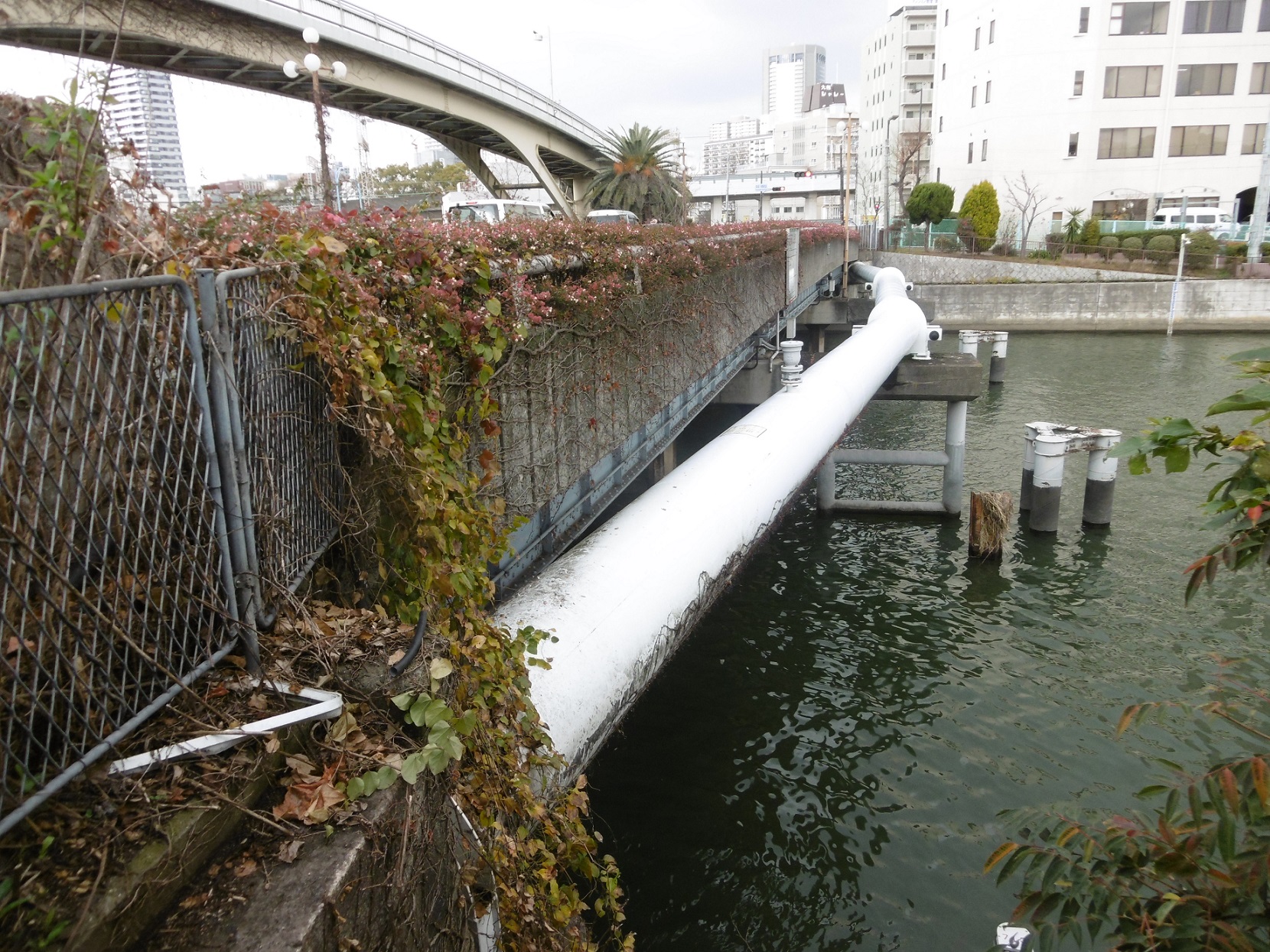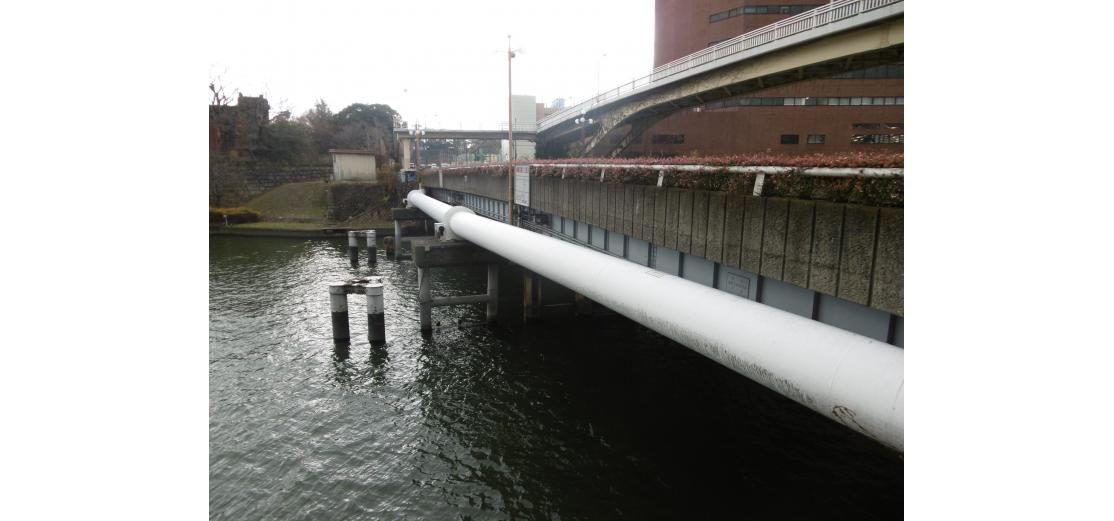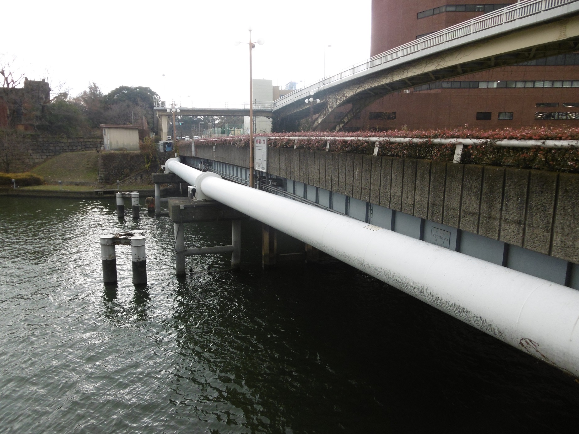 - (3)1985年,大阪城の石垣をモチーフにした外装,石畳調の擬石舗装,千成ひょうたんを模した照明.下部工根固.
