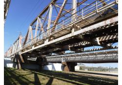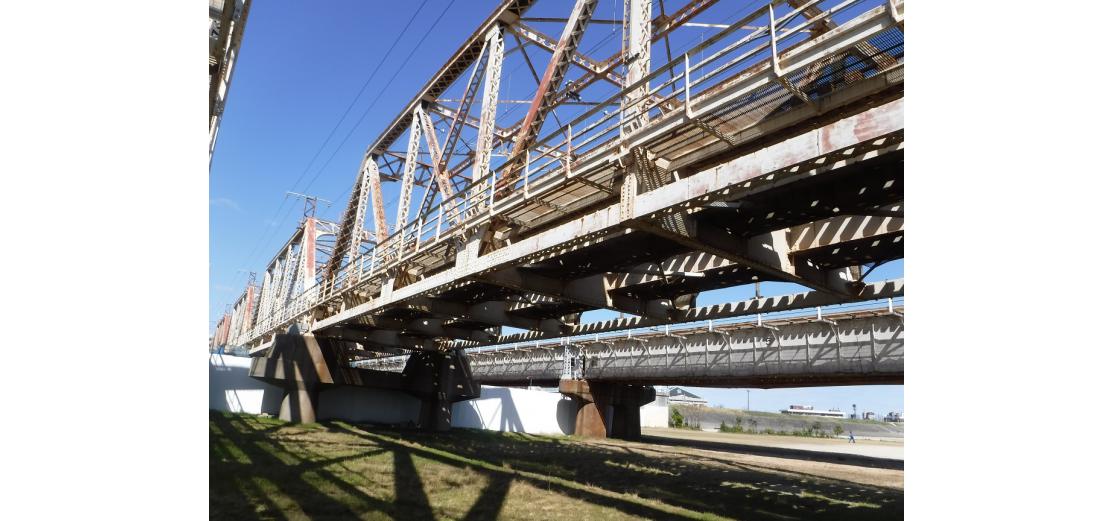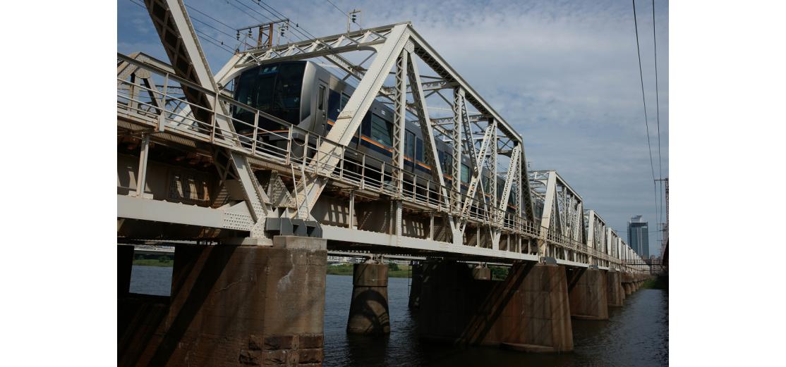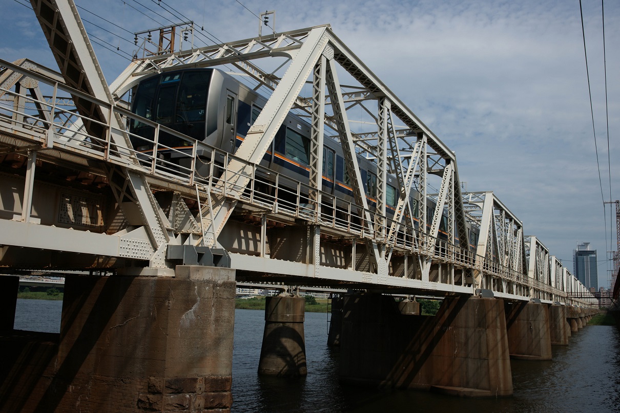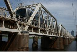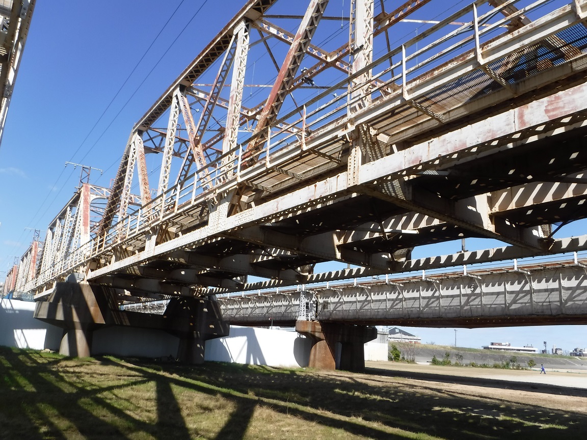 - (1)トラス22連. 上流側の下り内外線(鈑桁),下流側の梅田貨物線(複線プラットトラス)に挟まって架かっている.