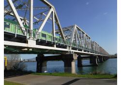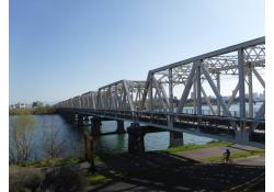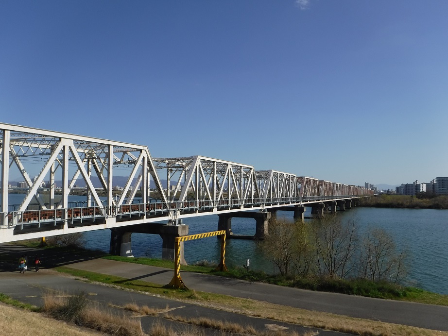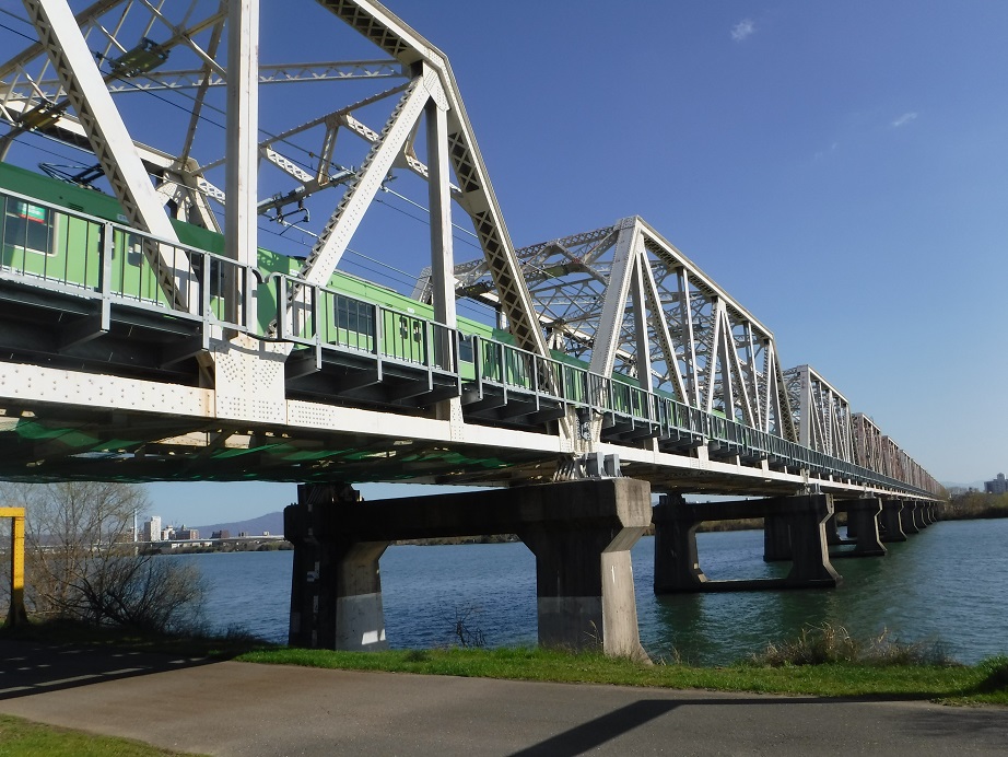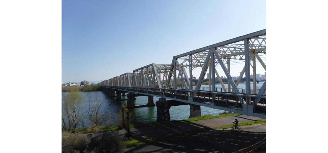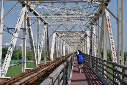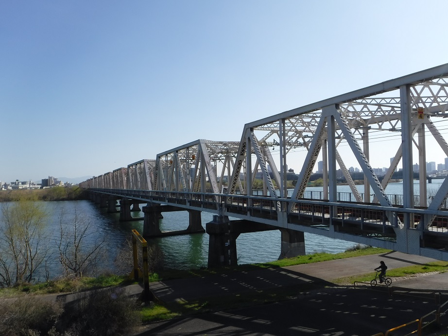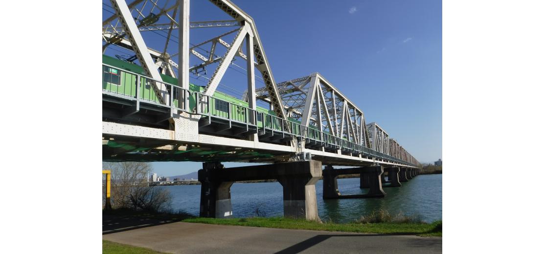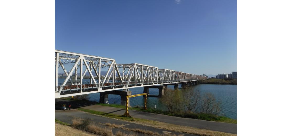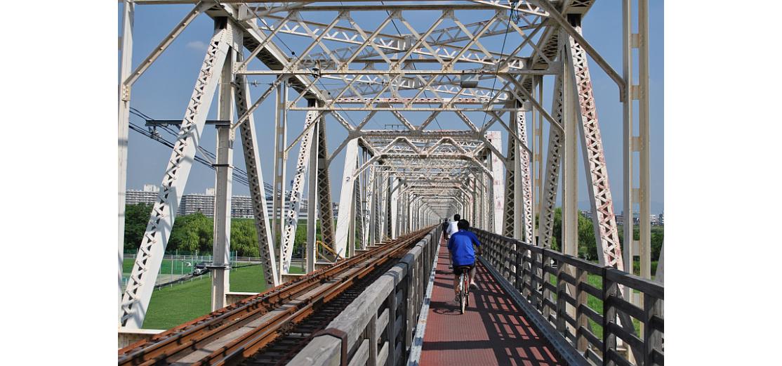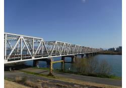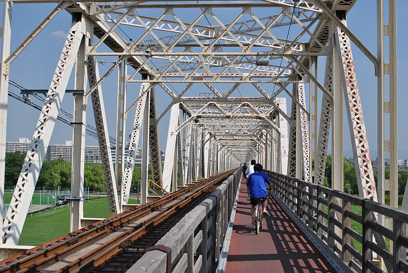 - (4)建設当初より複線トラスとして建設されたが,下流側の単線使用となっていた.上流側は大阪市が借り受け,歩道として仮設使用していた.