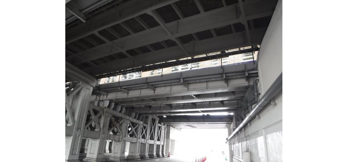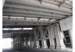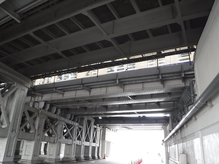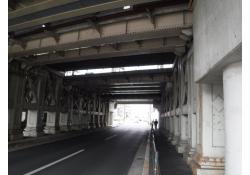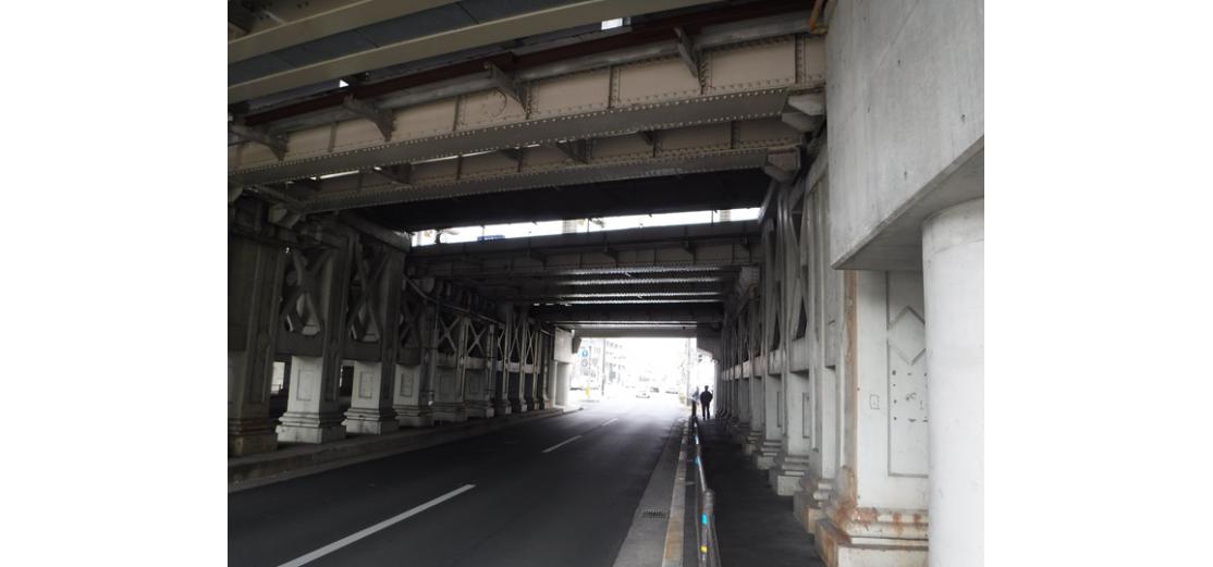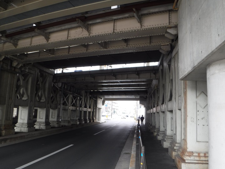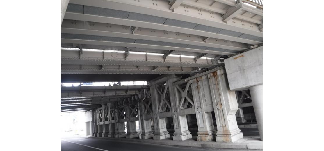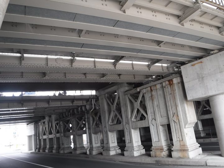 (1)細かな装飾(菱形飾り,ひれ状突起,曲面仕上げ)の入ったRC(元は鉄骨)橋脚.