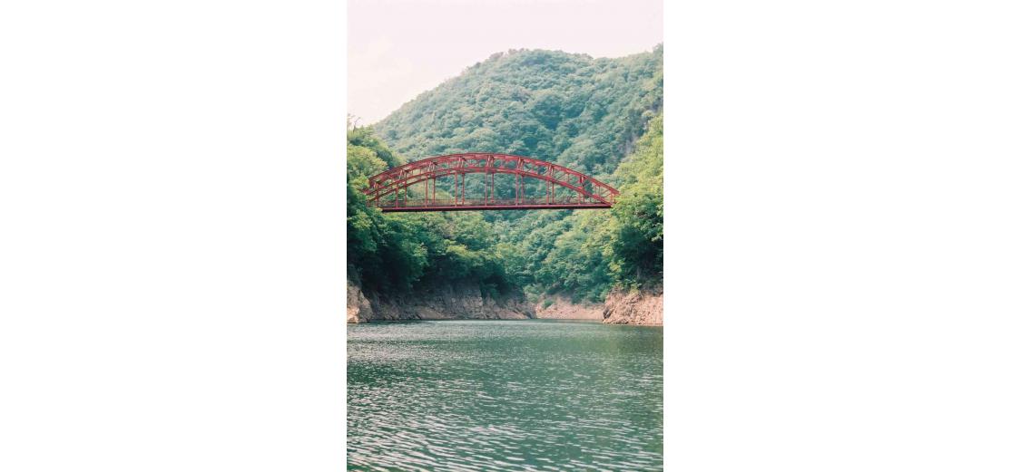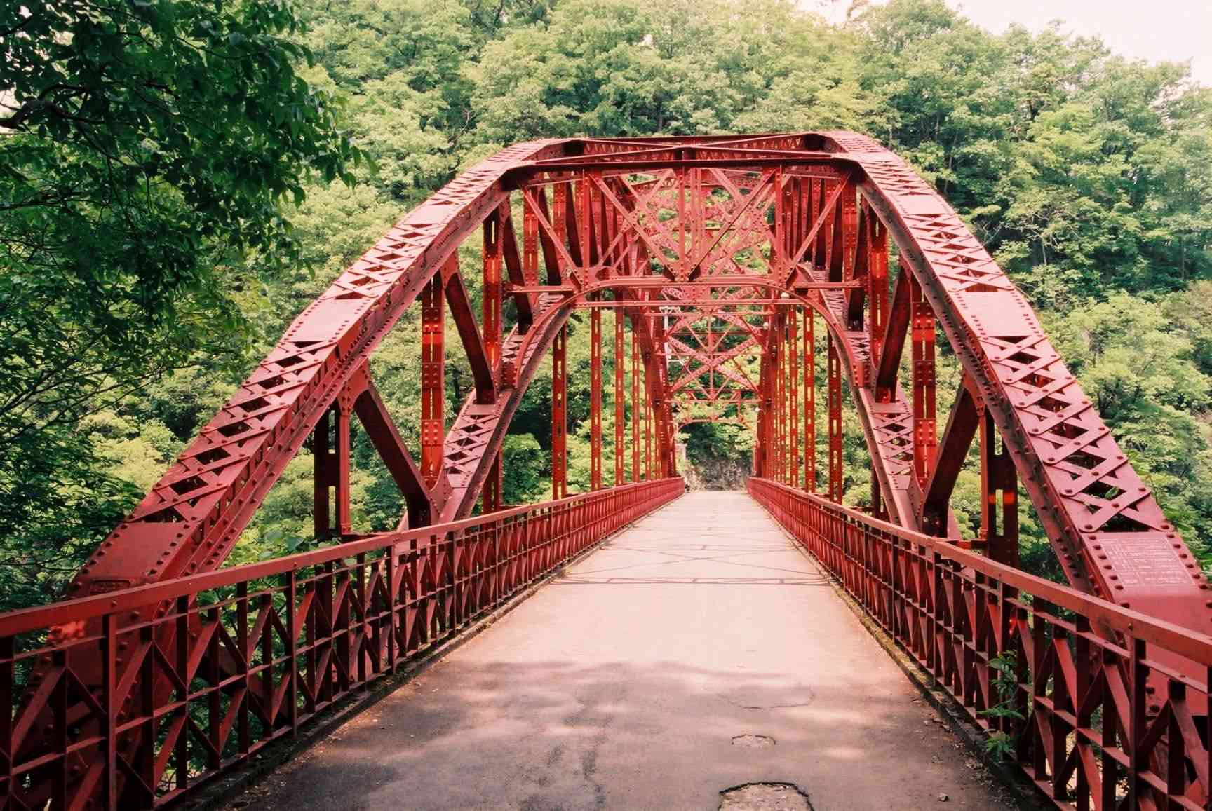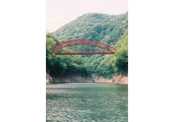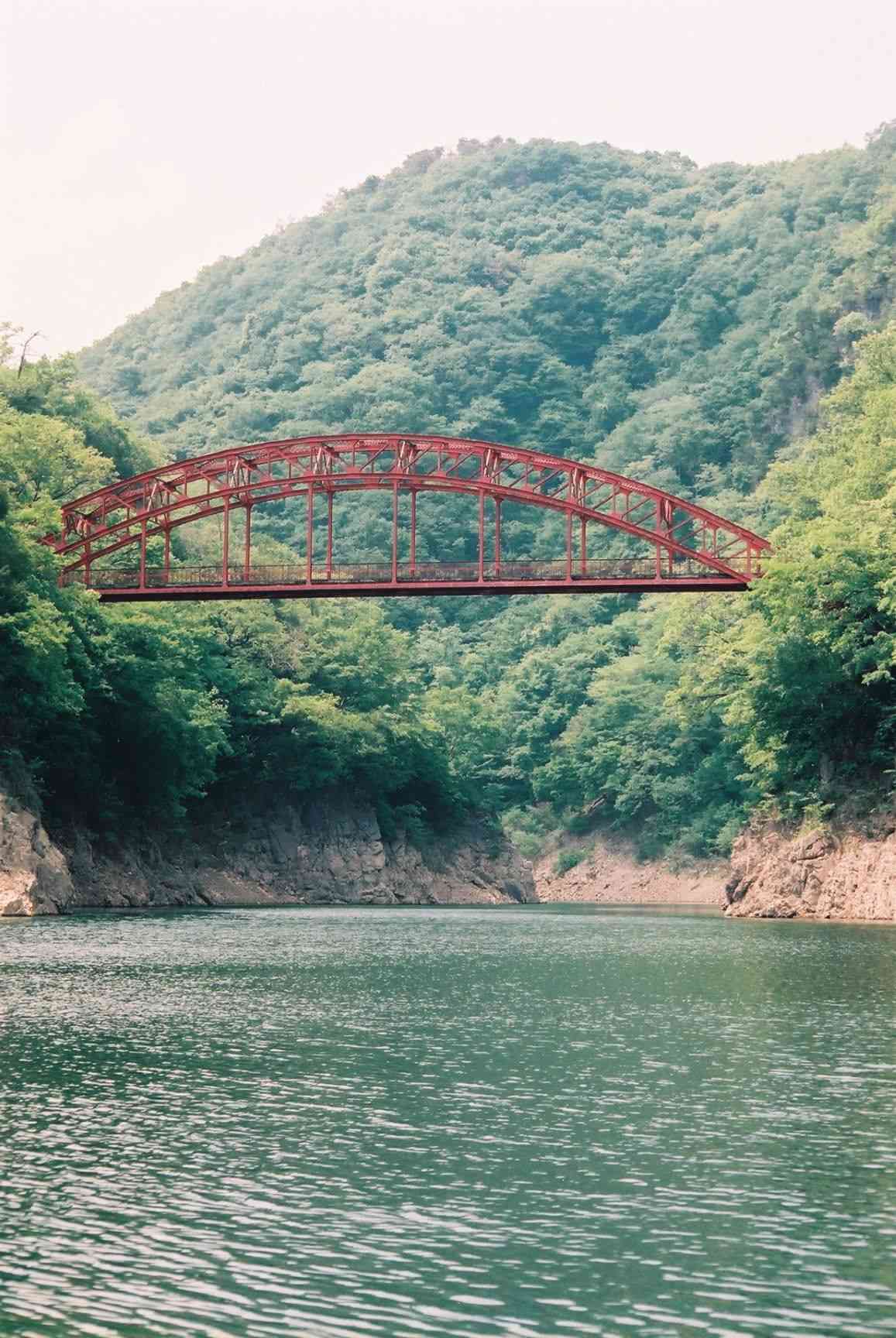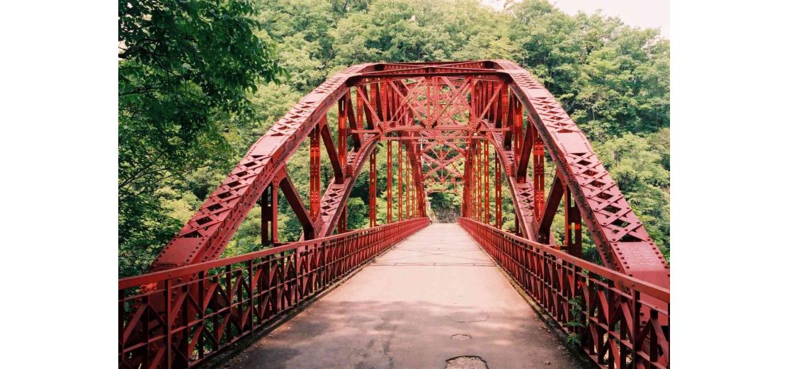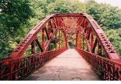 (1)帝釈峡遊歩道の入口に架かる赤いブレーストリブアーチ.