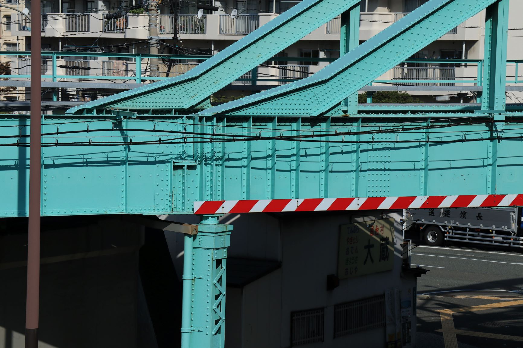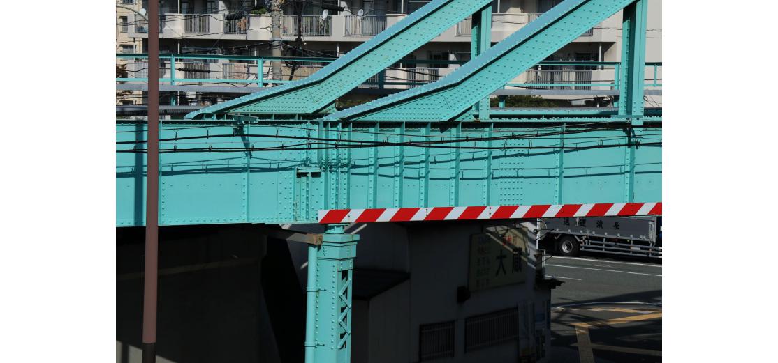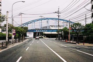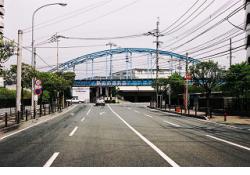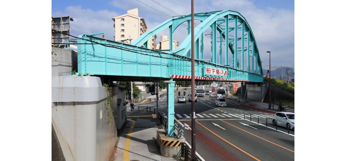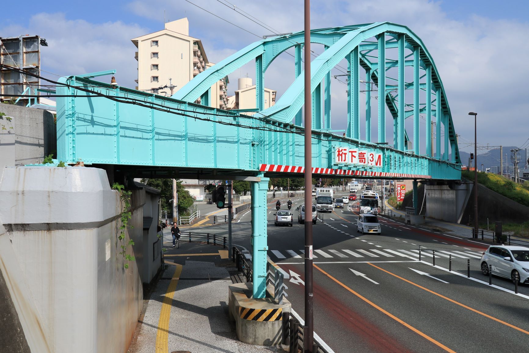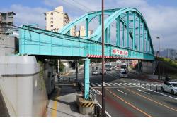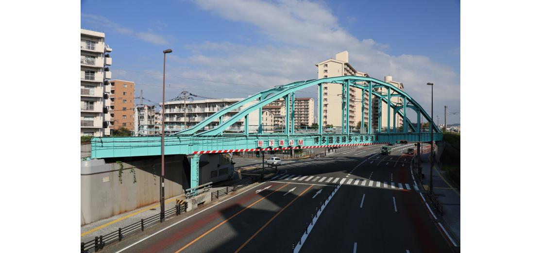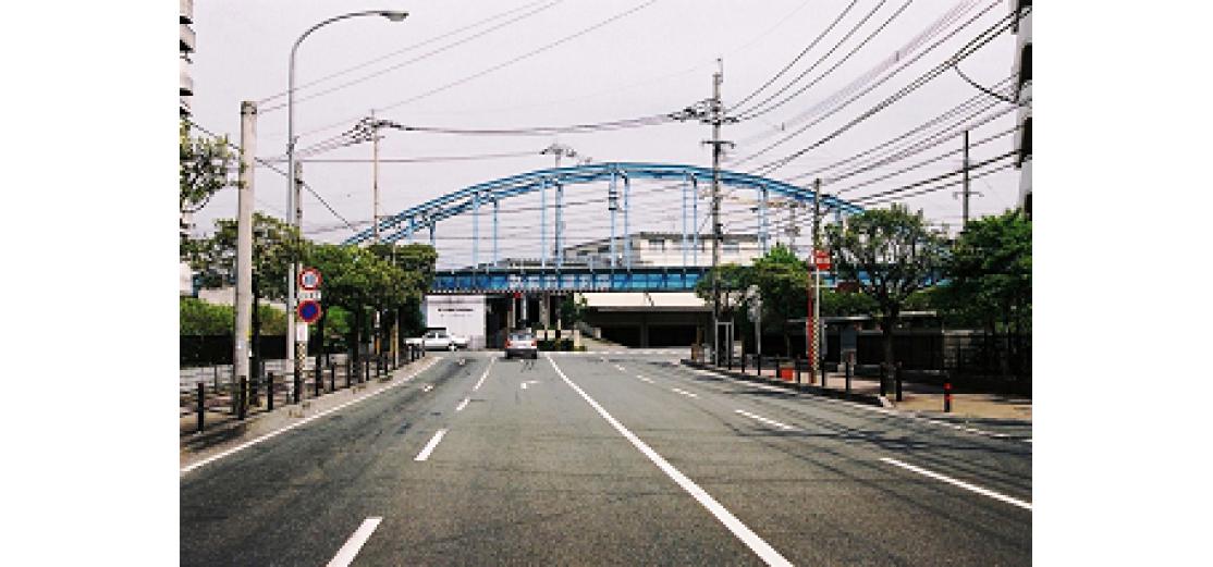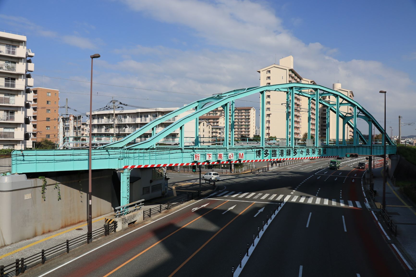 - (1)臨港線が国道3号を斜めに跨ぐ架道橋.
